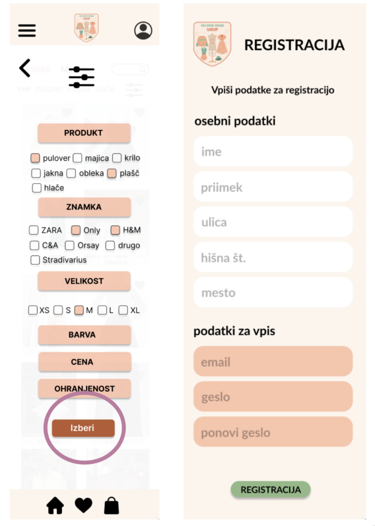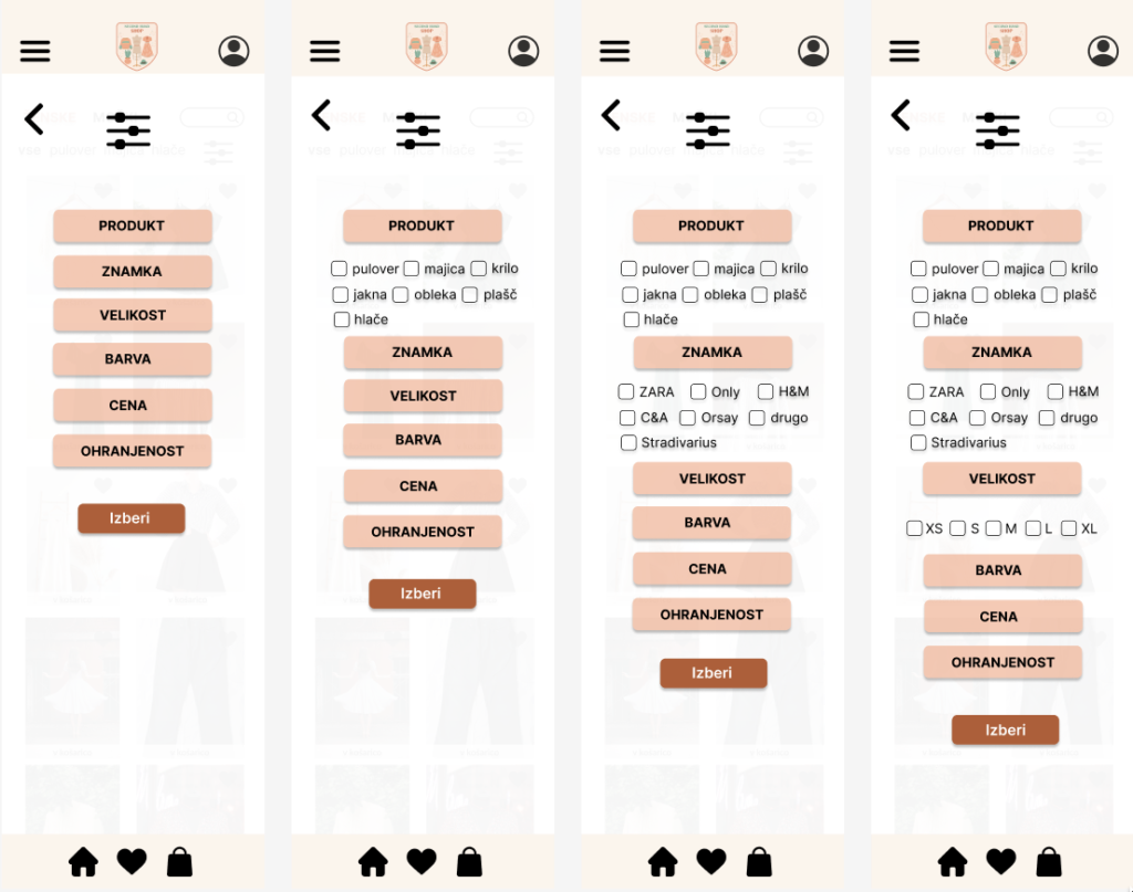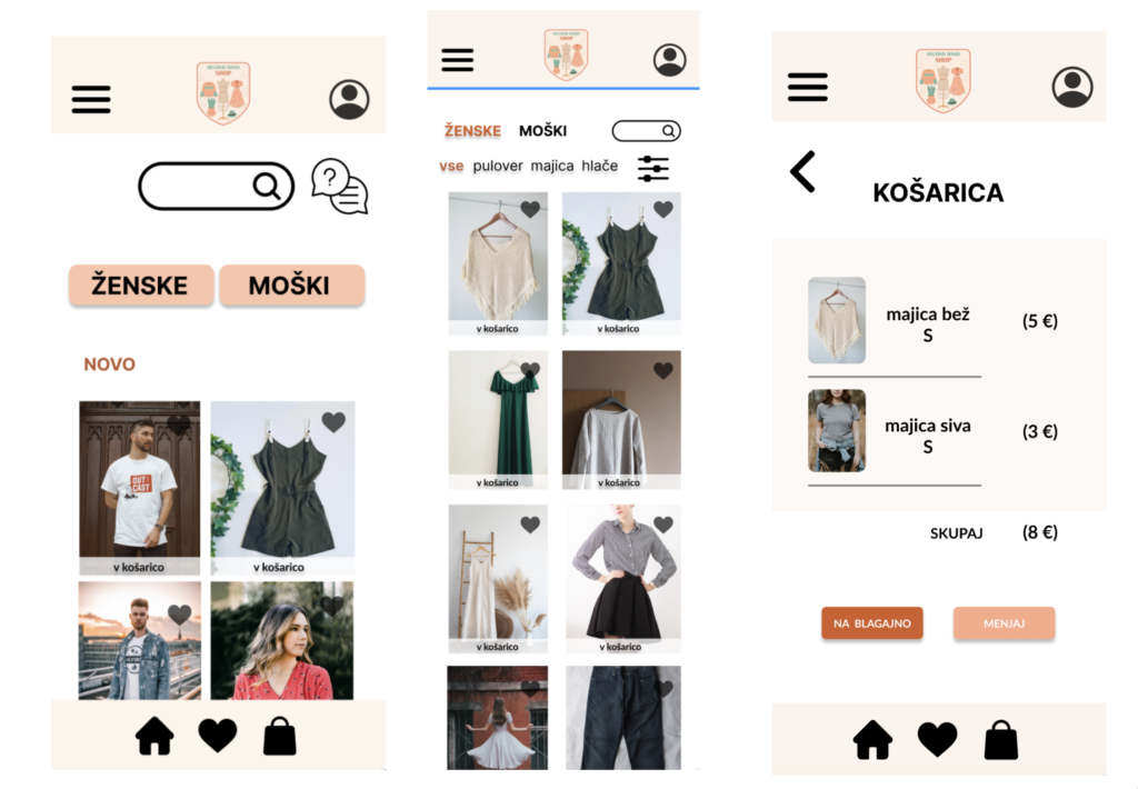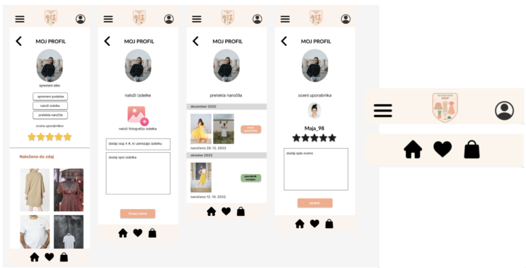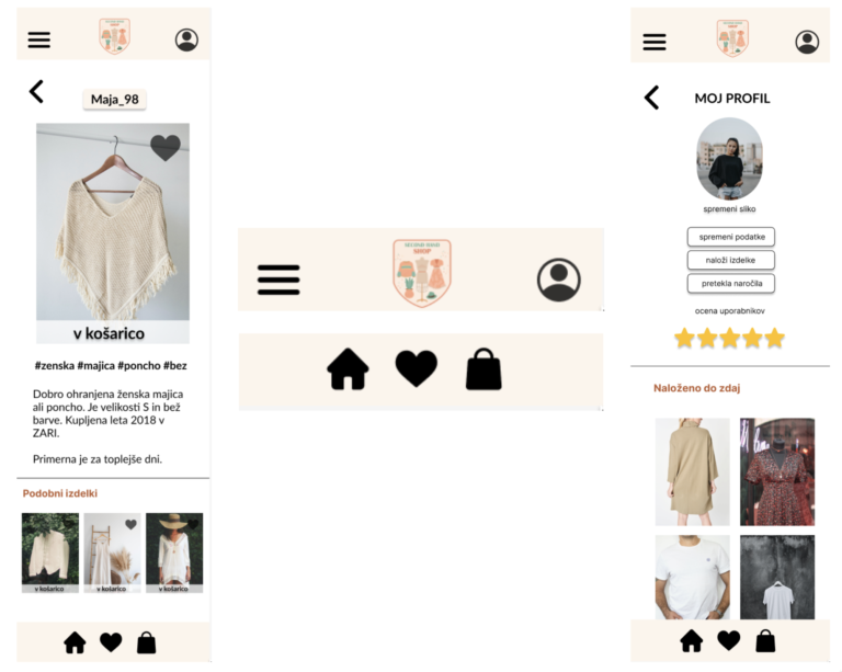 Uporabnik lahko preko bližnjic hitro pride na domač zaslon, v košarico, med všečkane izdelke. Prav tako lahko svoj profil prilagaja in ureja izdelke.