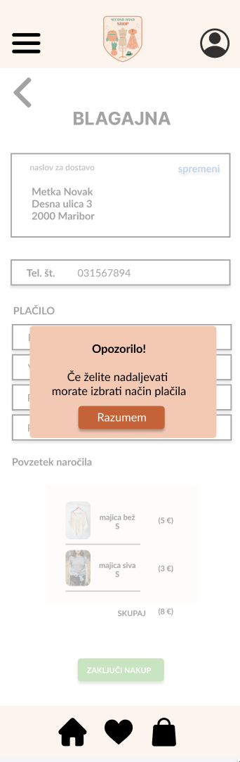 Ko nastopi težava sistem opozori nanjo. Kot na primer, da uporabnik ni izbral načina plačila in tako ne more nadaljevati postopka.