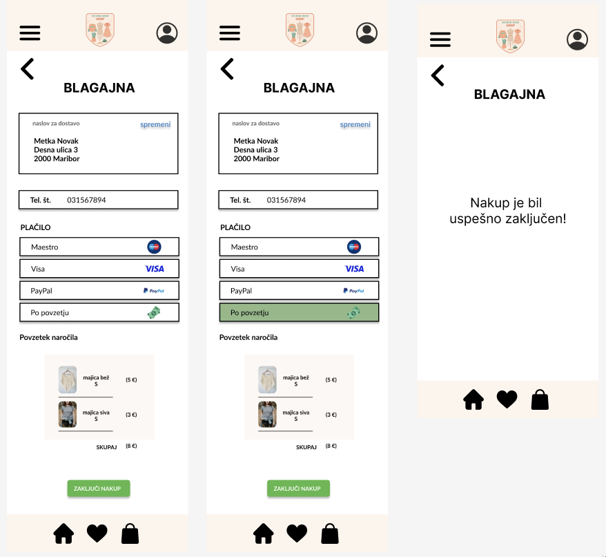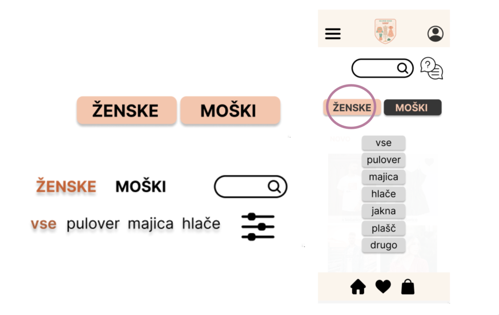Uporabniku je prikazano, ko ima neko polje izbrano. Na primer: Če je na začetni strani izbral polje moški, se bo to tudi obarvalo. Lepo so na straneh označeni tudi naslovi, torej na kateri strani se nahaja (prijava, blagajna itd.). Podobno je tudi pri kategorijah, ki jih lahko izberemo na strani z oblačili. Tudi tam je označeno na kaj smo kliknili.